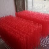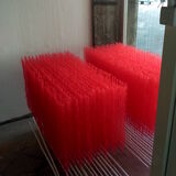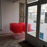 Two blocks of mohair suspended/hovering in the window niche of a shop
