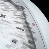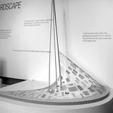 Impressions into the card-board pedestal and in-built coloured bars represent buildings on Wakefield's waterfront, including the new Hepworth Wakefield. Suspended on the threads are texts and images from local people, recalling their memories, views and visions about the city.