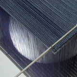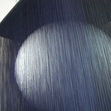 This sculpture consists of 12400 white silk threads, partially screen-printed dark blue, weighed down by steel bars. Each thread carries a ‘grain of weight’, little more than 1 gram. This adds up to a total of 2½ stones.